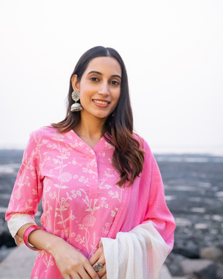 Pink Sanganeri Cotton Dobby Women Long Kurta