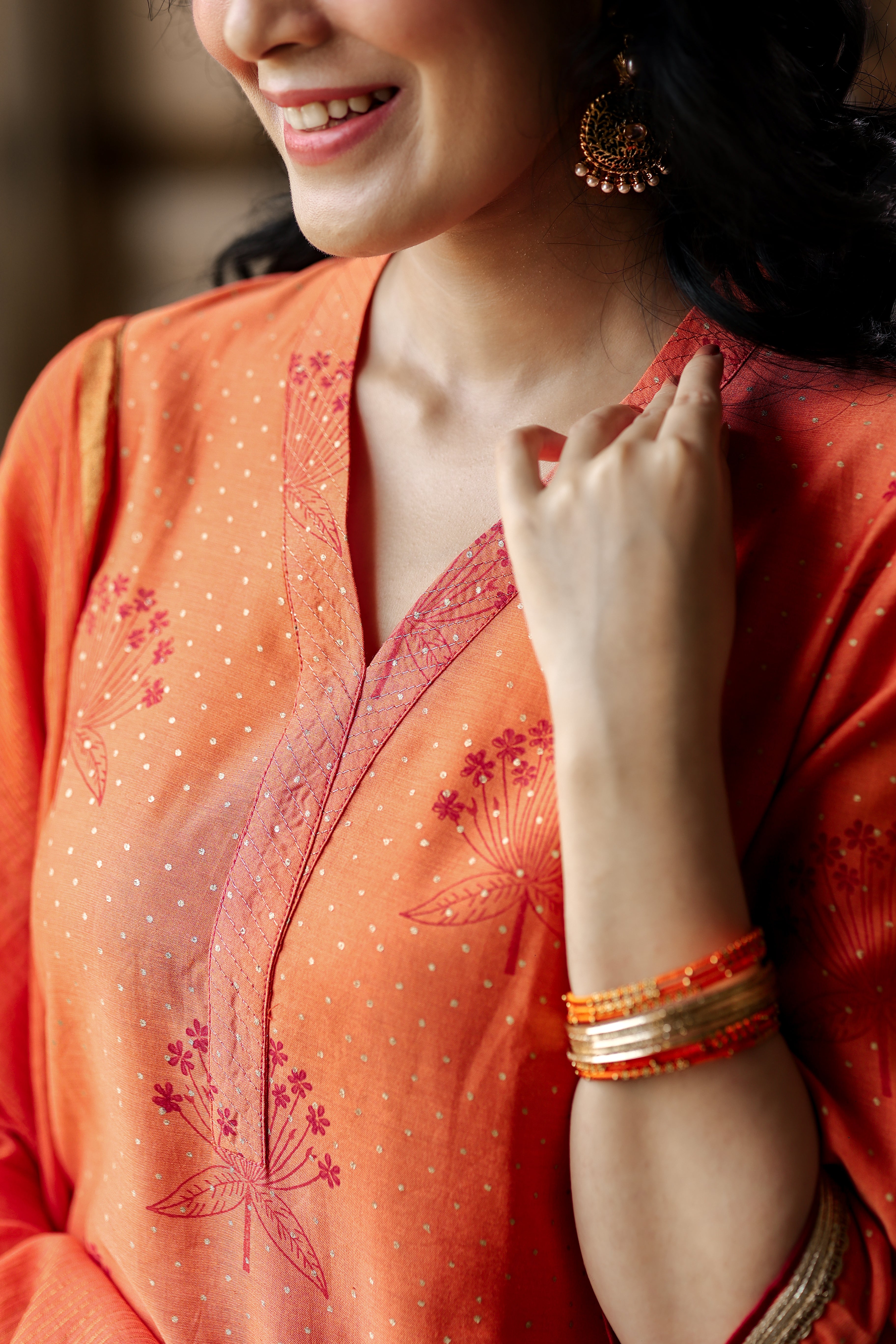 Rich dark coral hues meet traditional Sanganeri artistry in this elegant Chanderi silk kurta. Featuring a graceful long silhouette with full sleeves and a comfortable lining, it’s designed to offer both style and ease. Pair with our matching bottom and dupatta to complete your look.