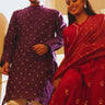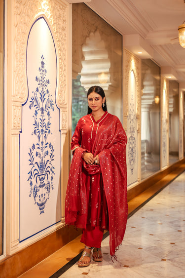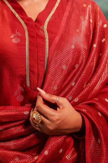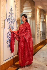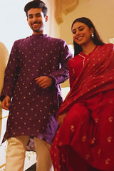 In a deep red hue, this Banarasi silk kurta highlights traditional craftsmanship for a timeless appeal. Designed in an elegant aline pattern for your perfect festive fit. Pair it with our matching bottoms.