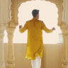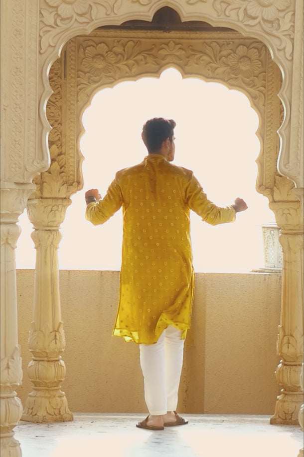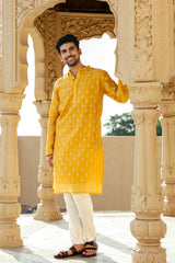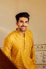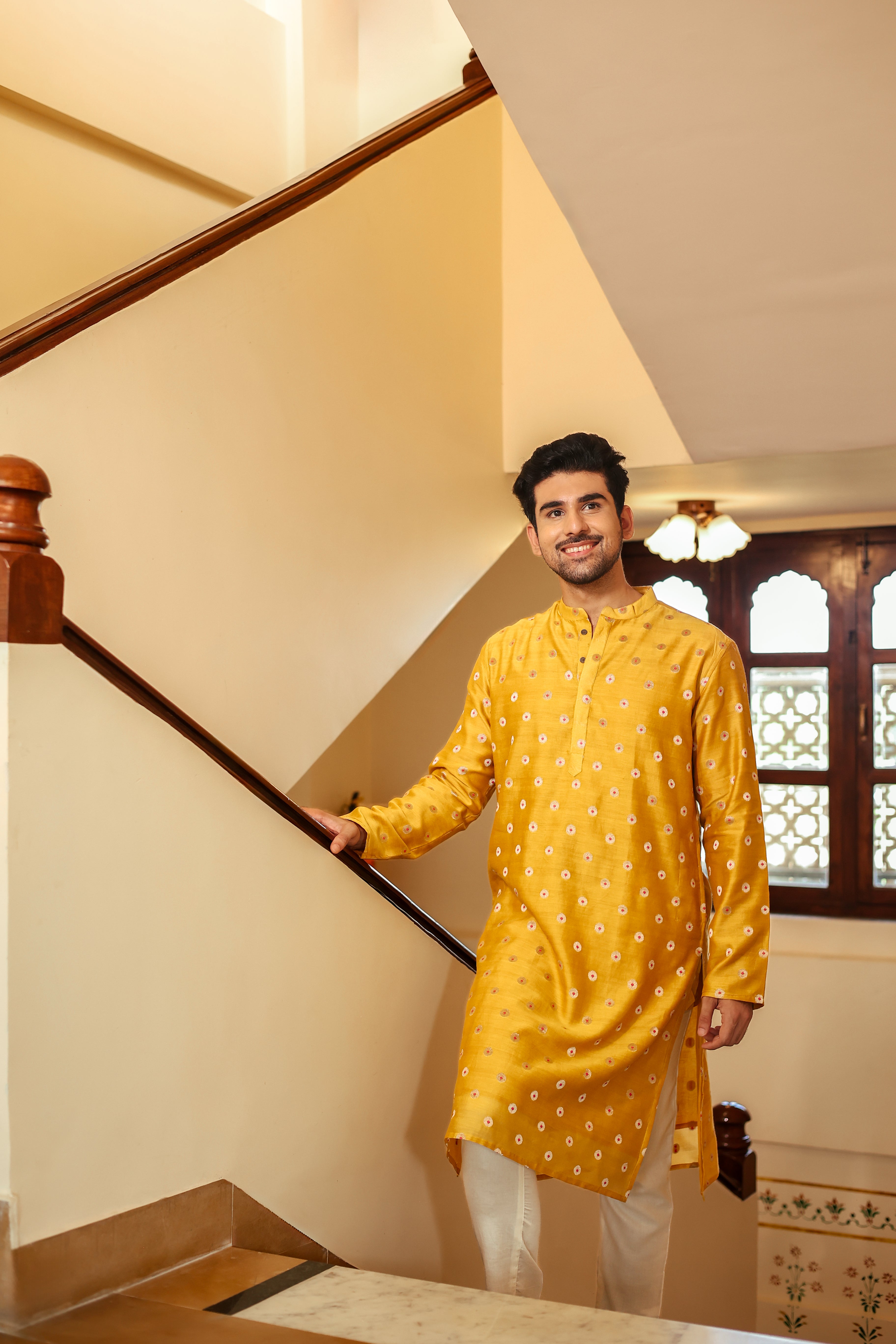 Striking in mustard yellow, this Banarasi silk kurta showcases delicate Mina Buta motifs for a refined, festive look. It offers both grace and ease. Features an attached lining