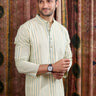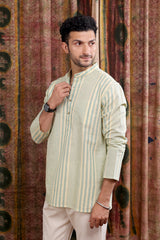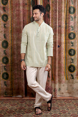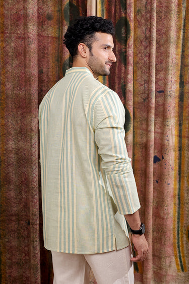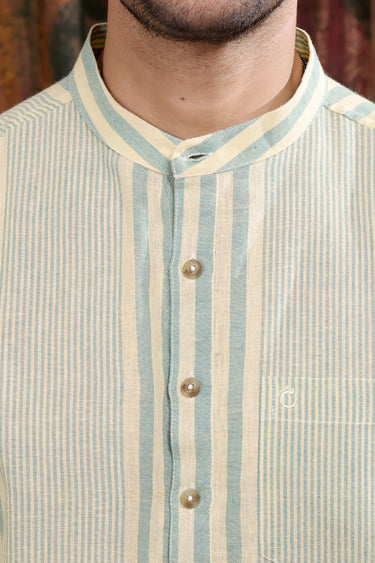 Sea Blue Stripes Cotton Linen Men Short Kurta Full Sleeves MSKFS253C3