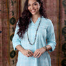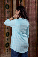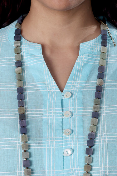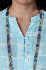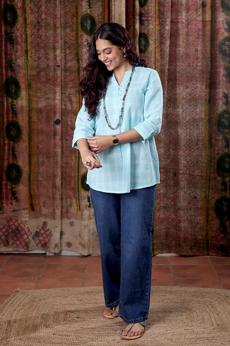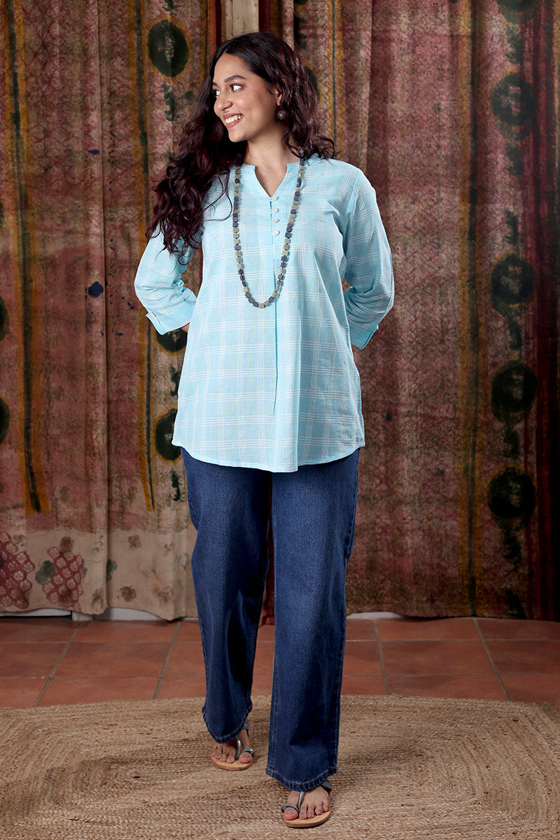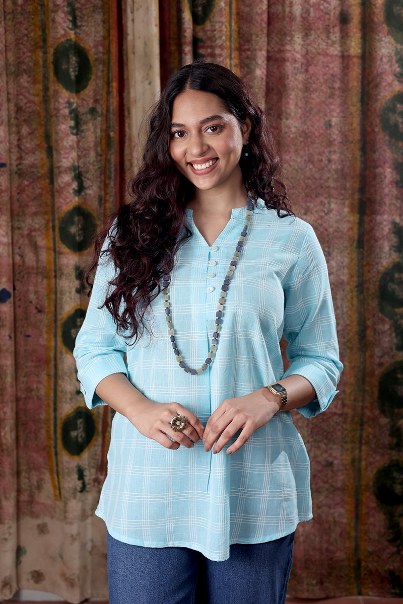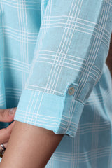 Sky Blue Checks South Cotton Women Kurti Long Sleeves WKILS252C6