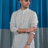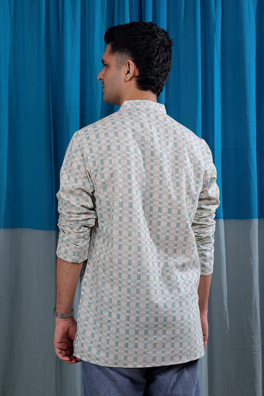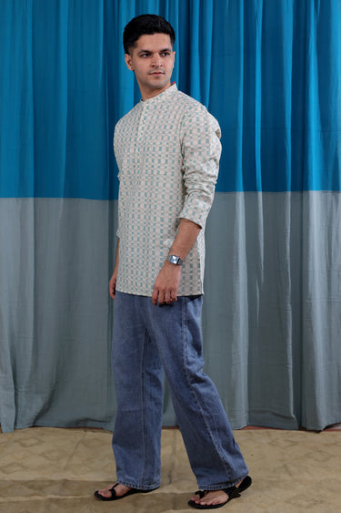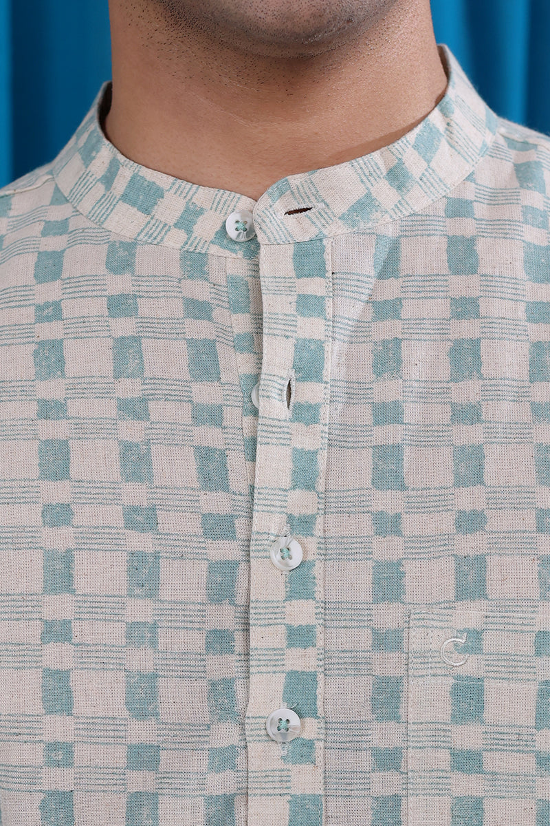 Teal Blue Sanganeri Natural Cotton Linen Men Short Kurta Full Sleeves MSKFS01265