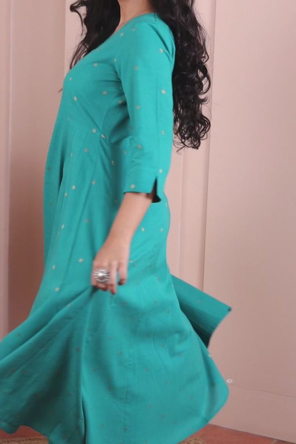 Turquoise Zari Buti South Cotton Women Ankle Kurta Long Sleeves WAKLS251C2